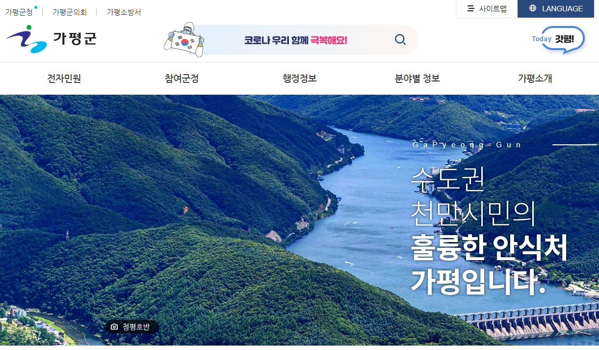 가평군청을 자세히 살펴보기 위해서는 가평군청 홈페이지로 접속하시는 것이 가장 빠른 방법입니다. 포털사이트에서 가평군청을 검색하시면 간편하게 접속을 하실 수가 있습니다.