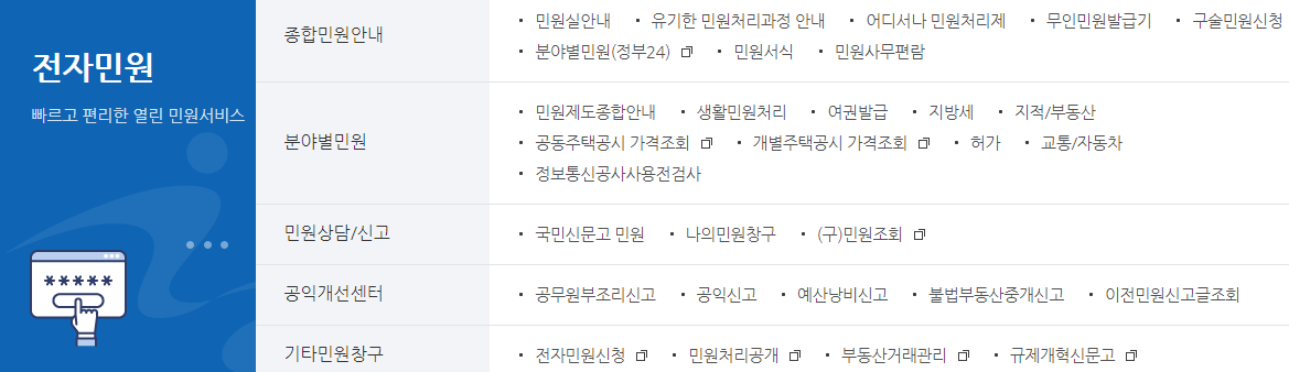 민원 관련 세부 메뉴들을 살펴보면 다음과 같습니다. 또한 전화번호 안내, 업무 및 직원검색, 조직도, 청사안내 등의 바로가기 메뉴를 알아보겠습니다.