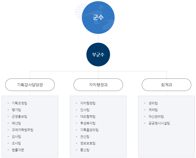 가평군청은 군수 아래에 부군수가 있으며 그 아래의 조직으로는 기획감사담당관, 자치행정과, 회계과 등의 부서가 있습니다.