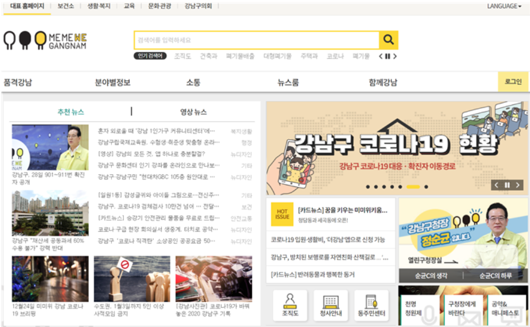 강남구청 홈페이지의 메인화면입니다. 현재는 코로나로 인해 구청홈페이지로 접속하시면 코로나 관련페이지가 먼저 나옵니다. 코로나 이외의 업무는 대표홈페이지에서 살펴보시면 됩니다.