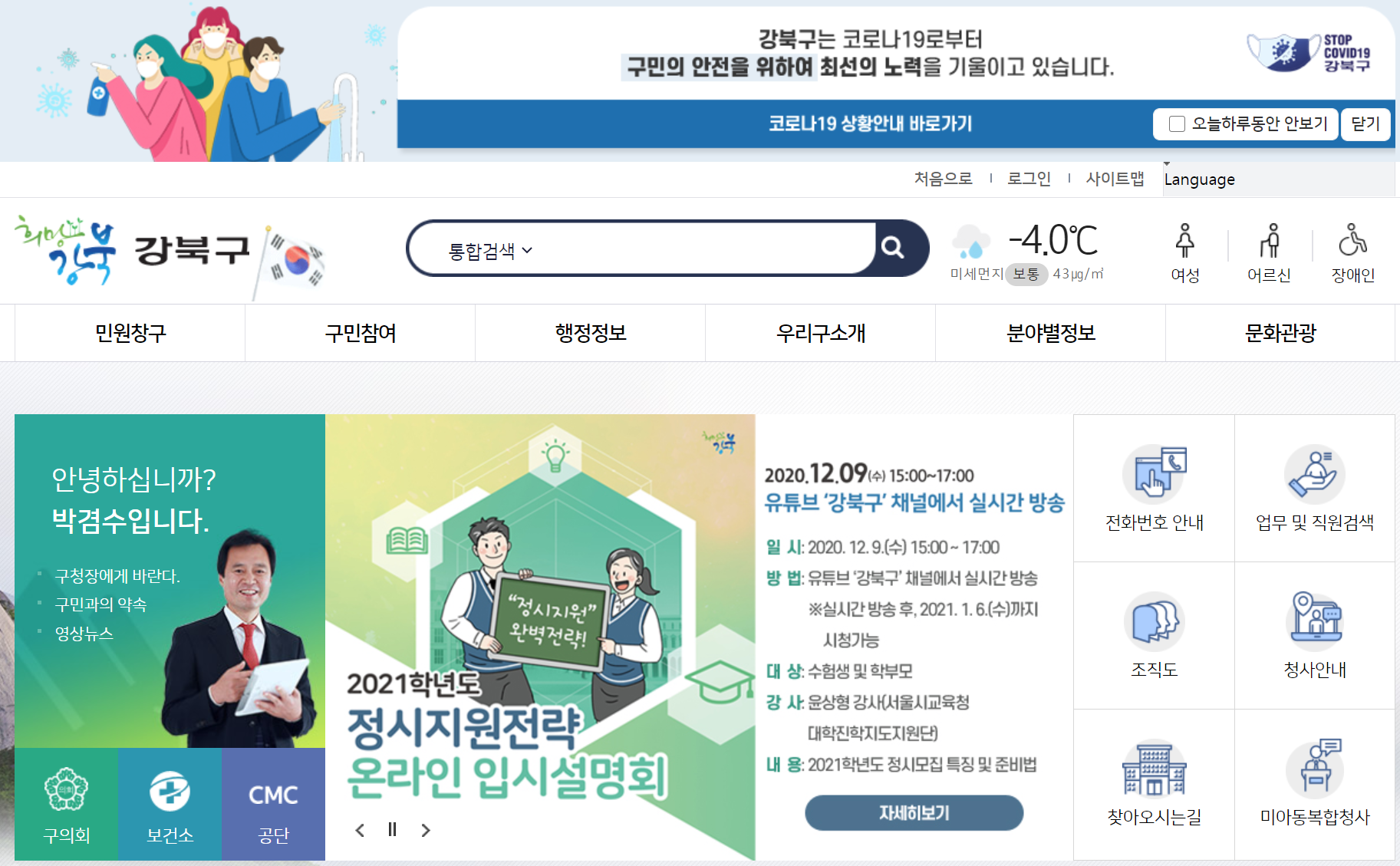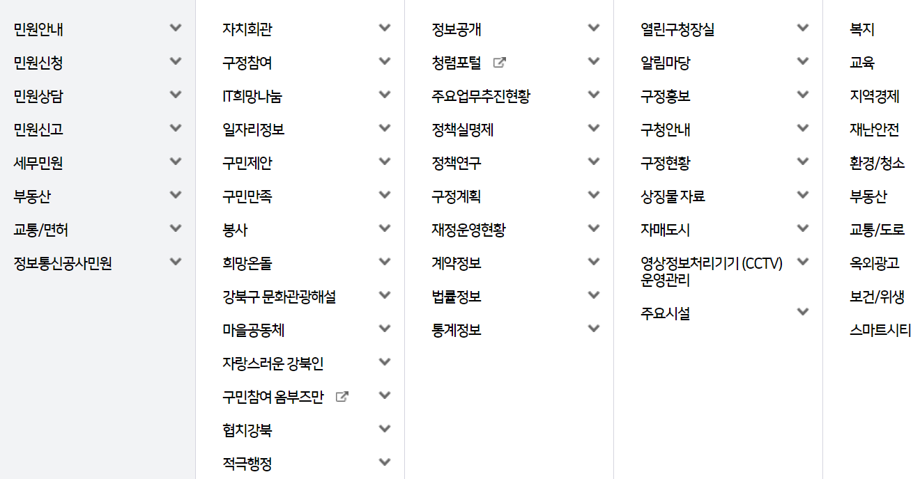 강북구청 홈페이지의 메인 화면입니다. 많은 업무를 수행하는 구청이기 때문에 아주 다양한 메뉴들을 확인하실 수 있습니다. 주요 메뉴로는 민원창구, 구민참여, 행정정보, 우리구소개, 분야별정보, 문화관광의 메뉴가 있습니다.