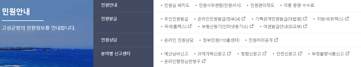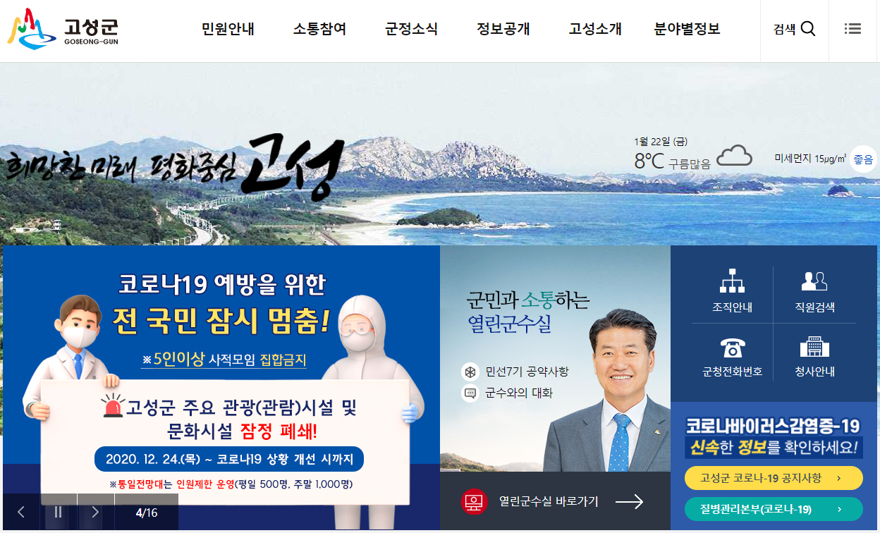 고성군청 홈페이지의 메인 화면입니다. 많은 업무를 수행하는 군청이기 때문에 아주 다양한 메뉴들을 확인하실 수 있습니다. 주요 메뉴로는 민원안내, 소통참여, 군정소식, 정보공개, 고성소개, 분야별정보의 메뉴가 있습니다.