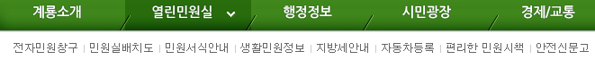 계룡시청 홈페이지의 메인 화면입니다. 많은 업무를 수행하는 시청이기 때문에 아주 다양한 메뉴들을 확인하실 수 있습니다. 주요 메뉴로는 민원창구, 구민참여, 행정정보, 우리구소개, 분야별정보, 문화관광의 메뉴가 있습니다.