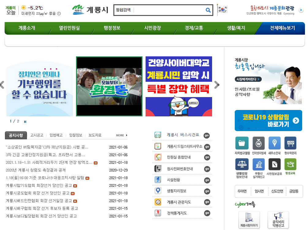 이상으로 계룡시청 홈페이지에 제공하는 정보에 대해 살펴보았습니다. 시청 업무를 보시기 전에 미리 확인하시고 방문하시면 아주 많은 도움이 될 것입니다.