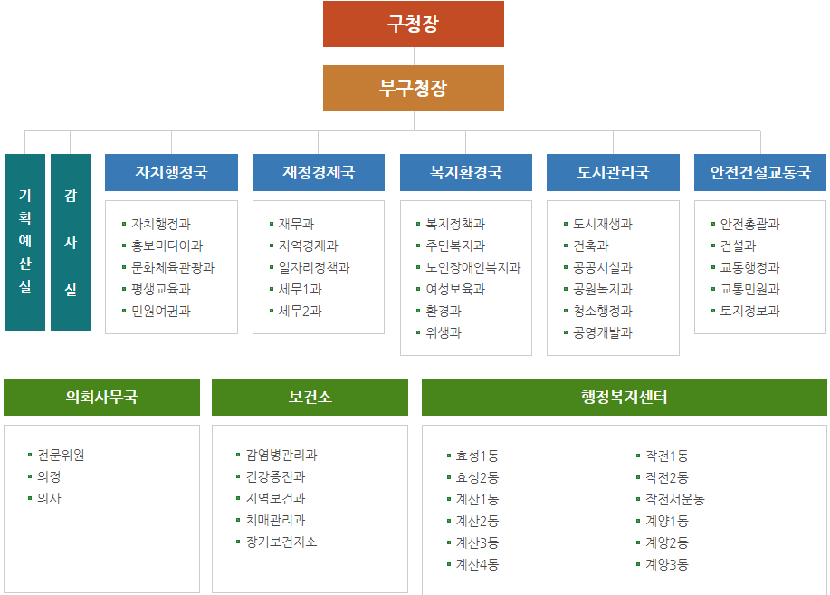 계양구청은 구청장 아래에 부구청장이 있으며 그 아래의 조직으로는 자치행정국, 재정경제국, 복지환경국, 도시관리국, 안전건설교통국 등의 부서가 있습니다.