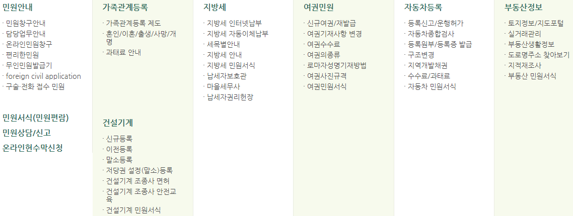 민원 관련 세부 메뉴들을 살펴보면 다음과 같습니다. 또한 전화번호 안내, 업무 및 직원검색, 조직도, 청사안내 등의 바로가기 메뉴를 알아보겠습니다.