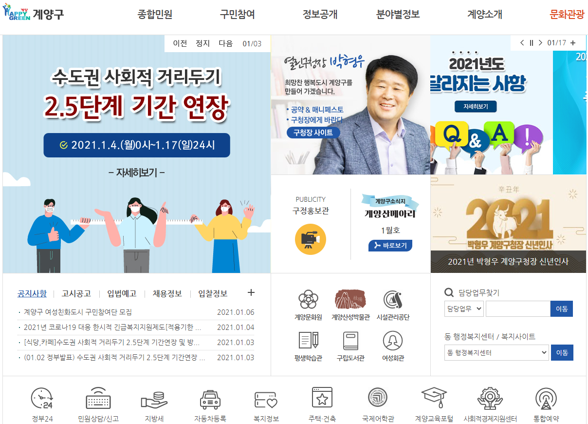 계양구청 홈페이지의 메인 화면입니다. 많은 업무를 수행하는 구청이기 때문에 아주 다양한 메뉴들을 확인하실 수 있습니다. 주요 메뉴로는 종합민원, 구민참여 정보공개, 분야별정보, 계양소개의 메뉴가 있습니다.