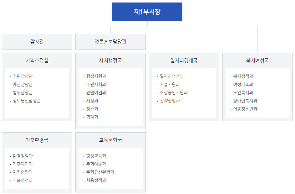 고양시청은 시장 아래에 1부시장, 2부시장이 있으며 그 아래의 조직으로는 기획조정실, 자치행정국, 일자리경제국, 복지여성국, 기후환경국, 교육문화국 등의 부서가 있습니다.