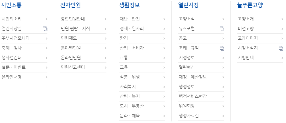 고양시청 홈페이지의 메인 화면입니다. 많은 업무를 수행하는 시청이기 때문에 아주 다양한 메뉴들을 확인하실 수 있습니다. 주요 메뉴로는 시민소통, 전자민원, 생활정보, 열린시정, 늘푸른고양, 문화관광의 메뉴가 있습니다.