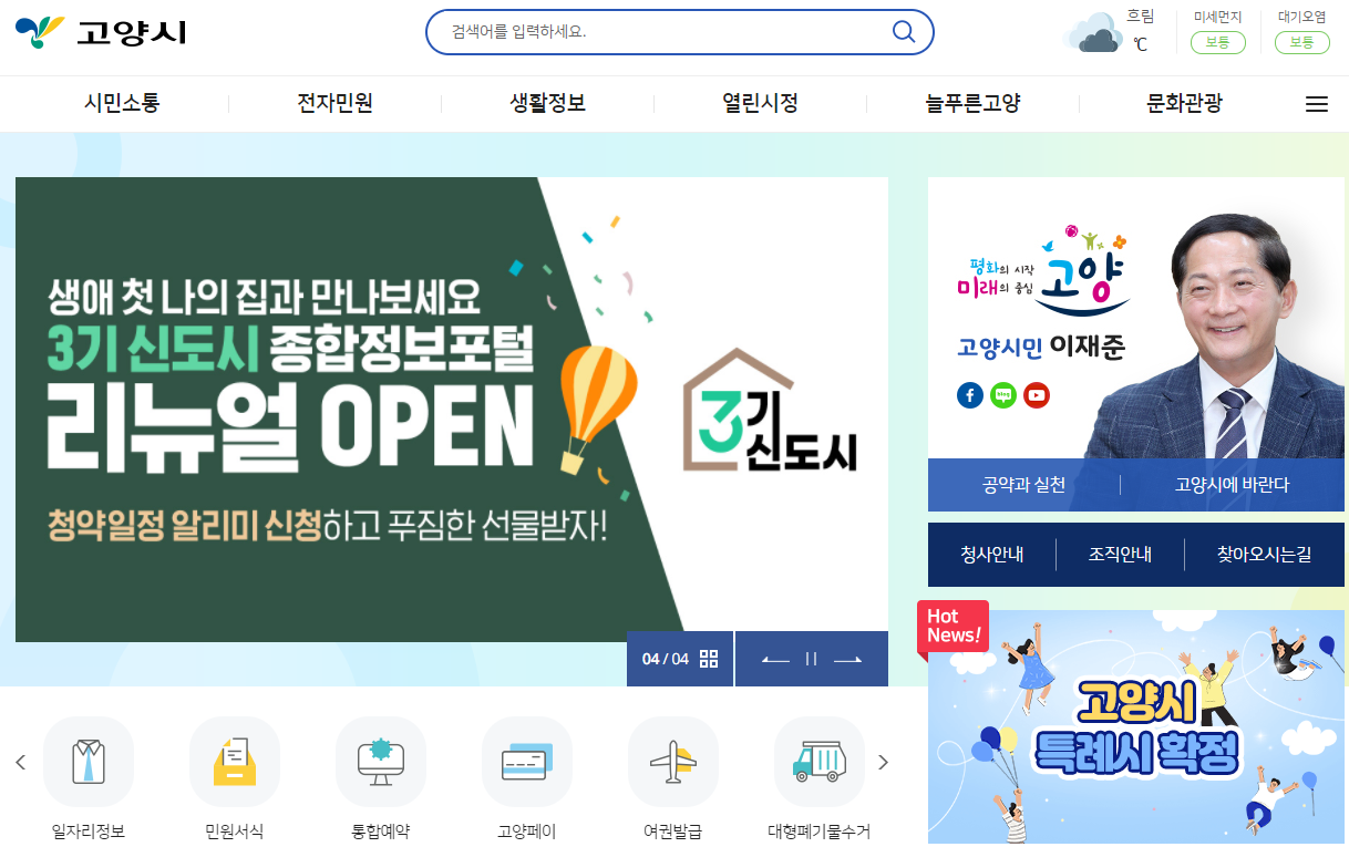 고양시청을 자세히 살펴보기 위해서는 고양시청 홈페이지로 접속하시는 것이 가장 빠른 방법입니다. 포털사이트에서 고양시청을 검색하시면 간편하게 접속을 하실 수가 있습니다.