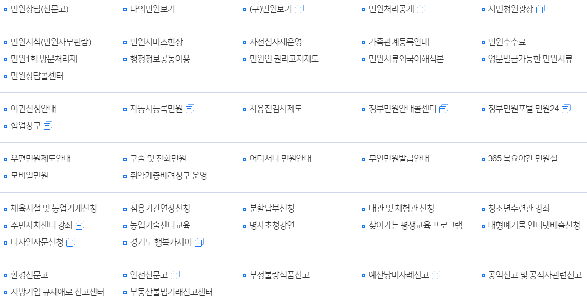 체육시설 및 농업기계신청점용기간연장신청분할납부신청대관 및 체험관 신청청소년수련관 강좌주민자치센터 강좌농업기술센터교육명사초청강연찾아가는 평생교육 프로그램대형폐기물 인터넷배출신청디자인자문신청경기도 행복카셰어