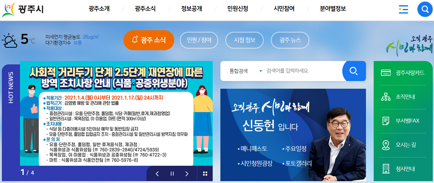 광주시청 홈페이지의 메인 화면입니다. 많은 업무를 수행하는 시청이기 때문에 아주 다양한 메뉴들을 확인하실 수 있습니다. 주요 메뉴로는 광주소개, 광주소식, 정보공개, 민원신청, 시민참여, 분야별정보의 메뉴가 있습니다.