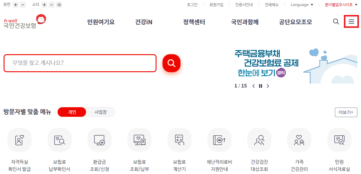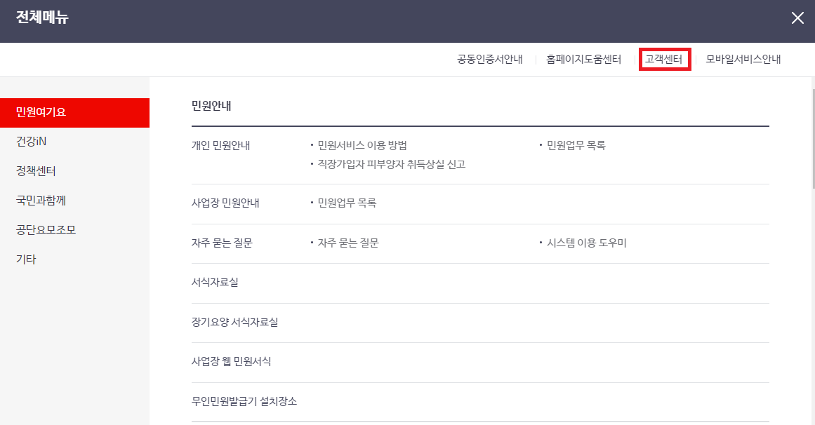 국민건공보험공단의 고객센터 메뉴로 이동을 위해서는 우측 상단에 있는 전체 메뉴 보기를 선택하면 됩니다.