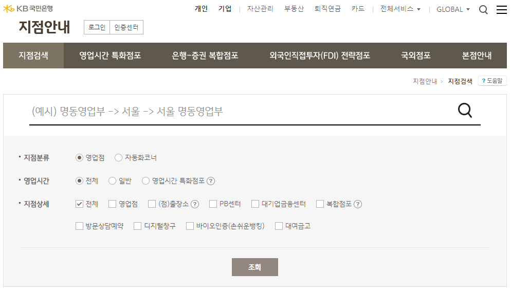 여러 방법에도 불구하고 영업점이나 지점을 통해서만 업무를 볼 수 있는 경우가 있습니다. 이럴 때는 가까운 국민은행 지점을 방문하시면 됩니다. 국민은행 홈페이지에서는 업무별로 다양한 지점을 간편하게 검색 할 수 있습니다. 지점 검색의 조건은 다음과 같습니다.