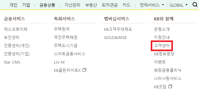 전체서비스에는 크게 4가지의 메뉴가 있습니다. 고객센터의 메뉴는 KB와 함께라는 메뉴에 포함되어 있습니다.