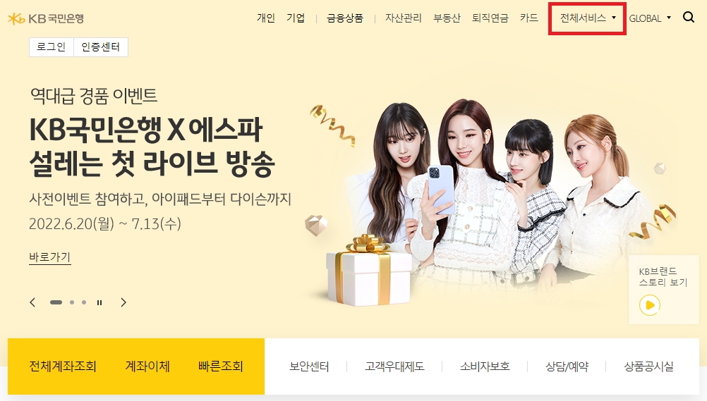 국민은행 홈페이지로 접속을 하셨다면 상단에 있는 메뉴중에서 전체서비스 메뉴를 찾으시면 됩니다. 화살표가 있는 것으로 보아 하위메뉴가 있을 것입니다. 이 전체서비스를 선택하시면 다양한 메뉴화면이 나오는 것을 볼 수 있습니다.