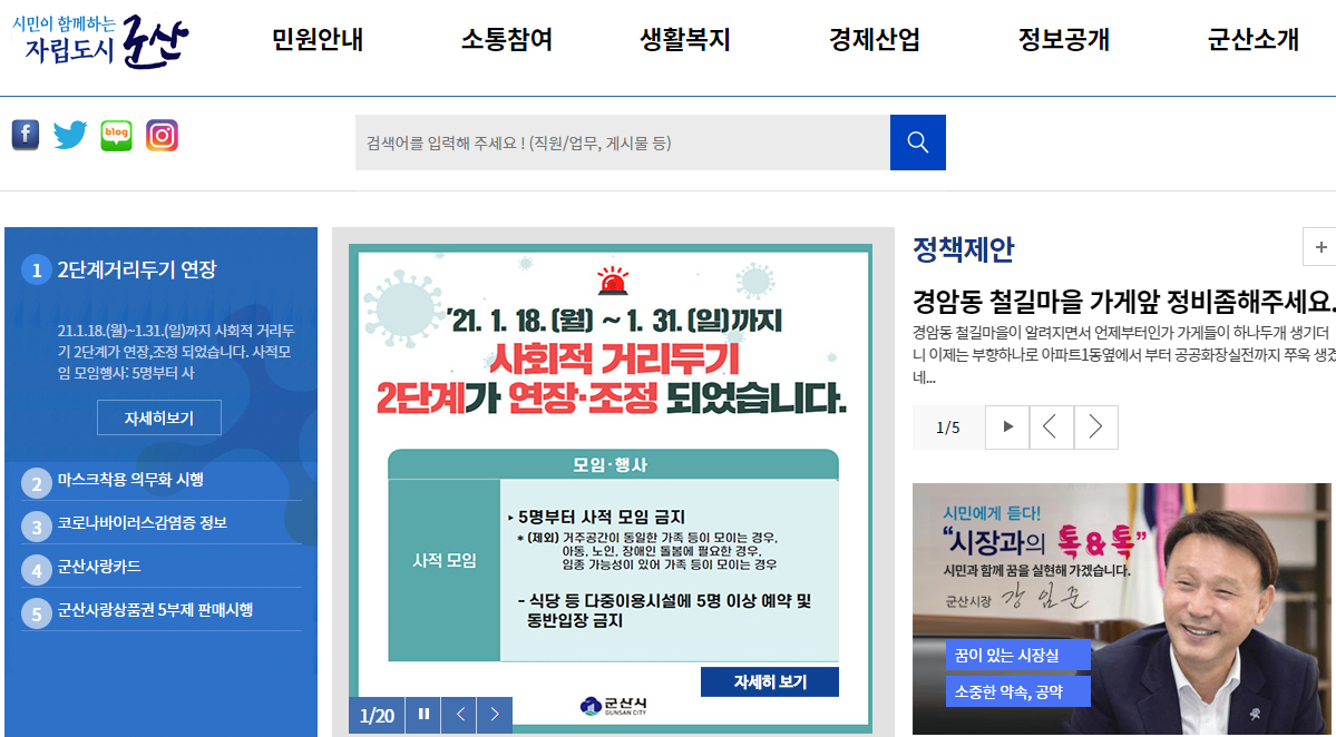 군산시청 홈페이지의 메인 화면입니다. 많은 업무를 수행하는 시청이기 때문에 아주 다양한 메뉴들을 확인하실 수 있습니다. 주요 메뉴로는 민원안내, 소통참여, 생활복지, 경제산업, 정보공개, 군산소개의 메뉴가 있습니다.