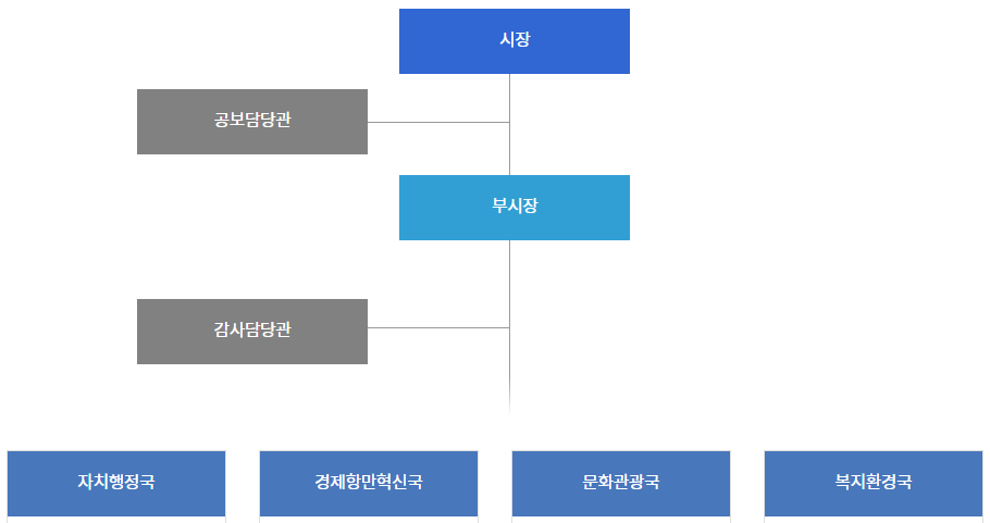 군산시청은 시장 아래에 부시장이 있으며 그 아래의 조직으로는 자치행정국, 경제항만혁신국, 문화관광국, 복지환경국, 공보담당관 등의 부서가 있습니다.