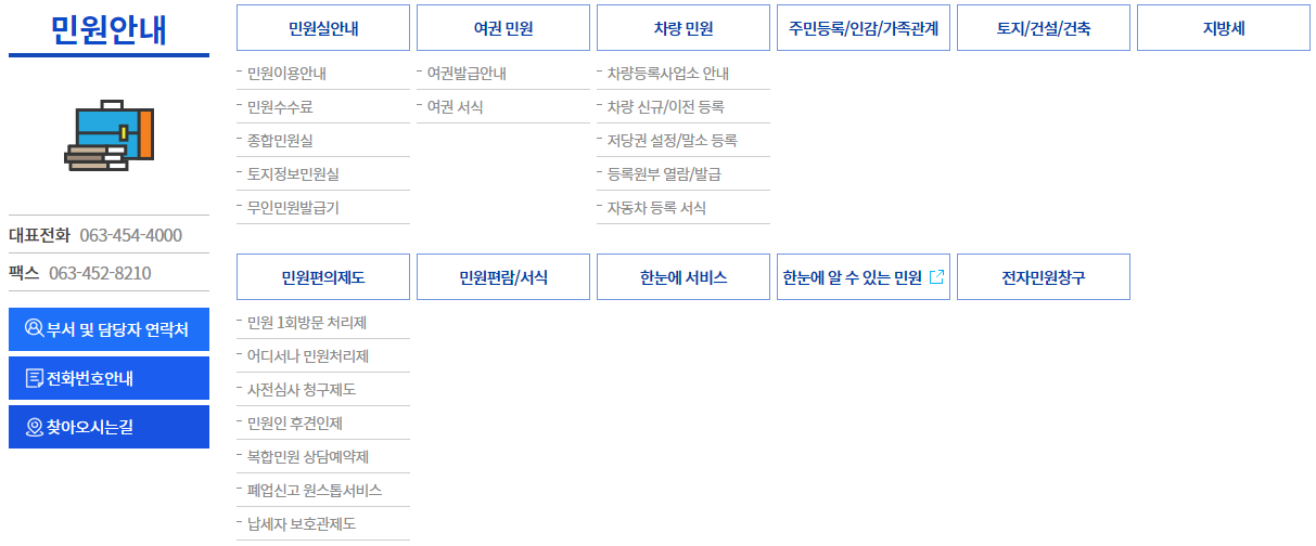 민원 관련 세부 메뉴들을 살펴보면 다음과 같습니다. 또한 자주 이용하는 서비스인 전화번호 안내, 업무 및 직원검색, 조직도, 청사안내 등의 바로가기 메뉴를 안내해 드립니다.