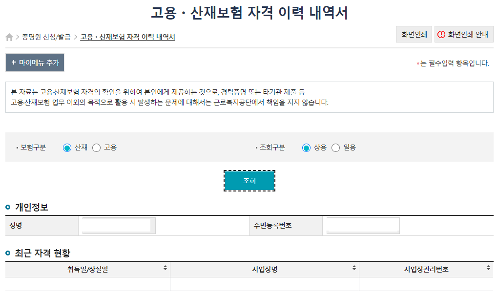 간단하게 고용산재보험 자격 이력 내역서를 확인해 보겠습니다. 자주찾는 메뉴에서 해당 서비스를 선택하고 조회를 누르면 아래와 같이 최근 자격현황의 취득일, 상실일, 사업장명, 사업장관리번호가 조회됩니다.