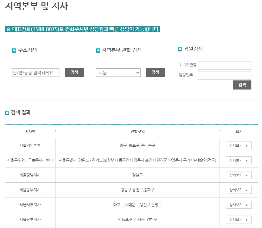 고용산재보험 토탈서비스 업무 처리를 위해서 가까운 지사검색은 여기를 통해서 간편하게 하실 수 있습니다. 관할지역이 다르기 때문에 꼭 검색을 하고 방문하는 것이 좋습니다.