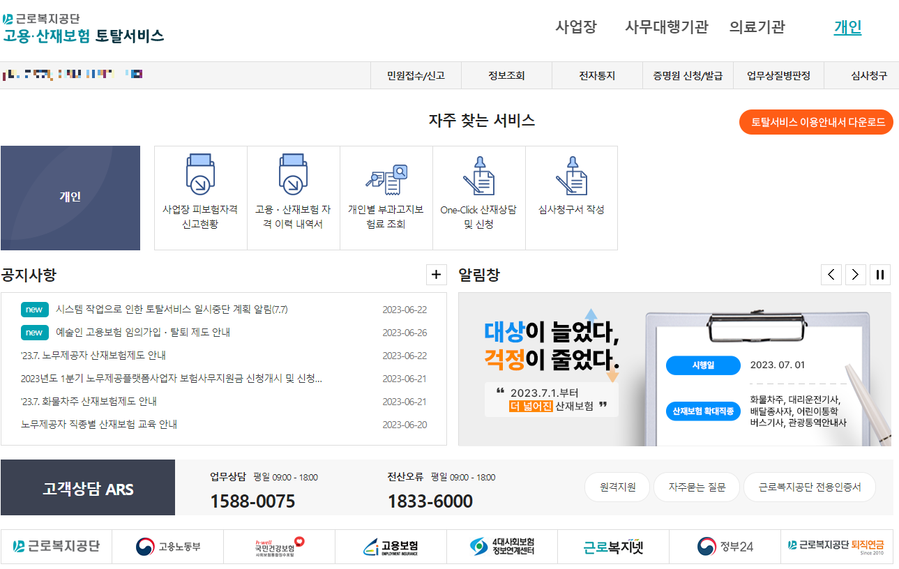 - 개인 : 사업장 피보험자격 신고현황, 고용산재보험 자격 이력 내역서, 개인별 부과고지보험료 조회, 휴업급여 청구, 산재환자 정보조회, One-Click 산재상담 및 신청, 보험급여지급확인원, 심사청구서 작성