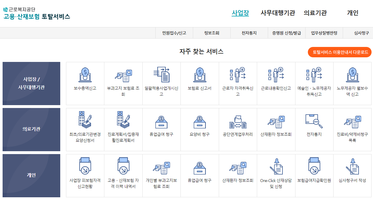 - 사업장/사무대행기관 : 보수총액신고, 부과고지 보험료 조회, 일괄적용사업개시신고, 보험료 신고서, 근로자 자격취득신고, 근로내용확인신고, 예술인/노무제공자 취득신고, 노무제공자 월보수액 신고