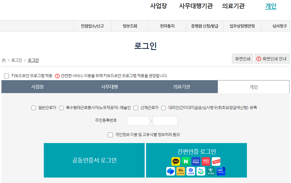 개인이 고용산재보험 토탈서비스 서비스를 이용하려면 로그인이 필요합니다. 로그인은 공동인증서 또는 간편 인증 로그인을 통해서 로그인을 하면 됩니다.