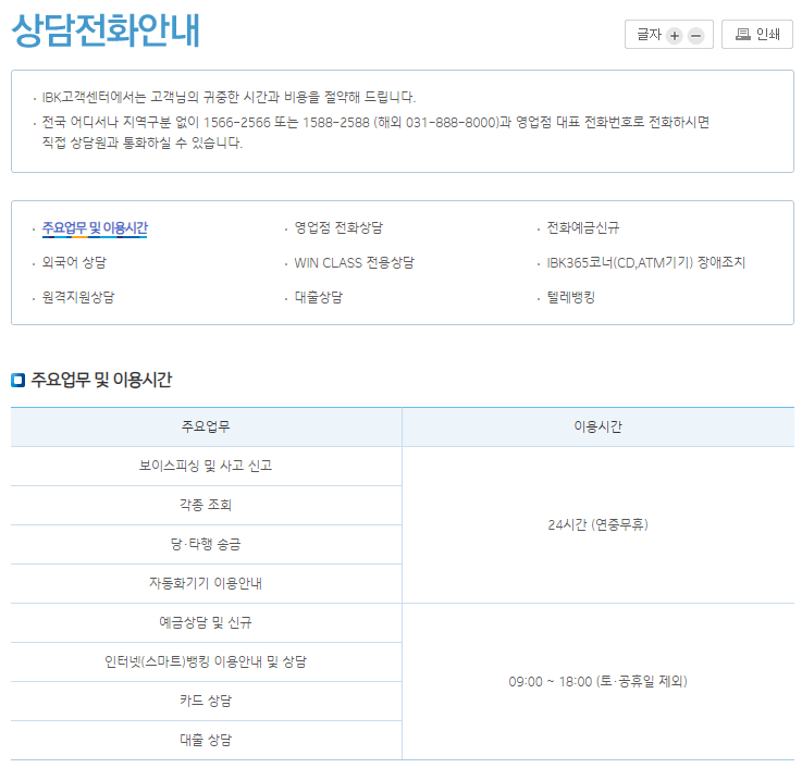 전국의 어디서나 지역에 상관없이 1566-2566 또는 1588-2588을 통해서 기업은행 고객센터로 연결 후 상담원과 통화를 할 수 있습니다. 하지만 모든 업무를 24시간 제공하는 것이 아니기 때문에 주요 업무와 이용시간을 알아두어야 합니다.