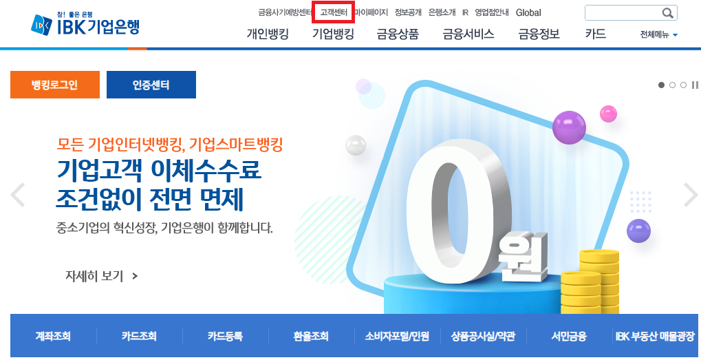 이미 기업은행을 이용중인 분들이 고객센터 대한 내용을 찾으시려면 가장 상단에 있는 고객센터 메뉴를 선택해 주시면 됩니다.