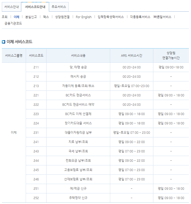 | 서비스 코드 | 서비스 내용 | ARS 서비스 시간 | 상담원 연결가능시간 |