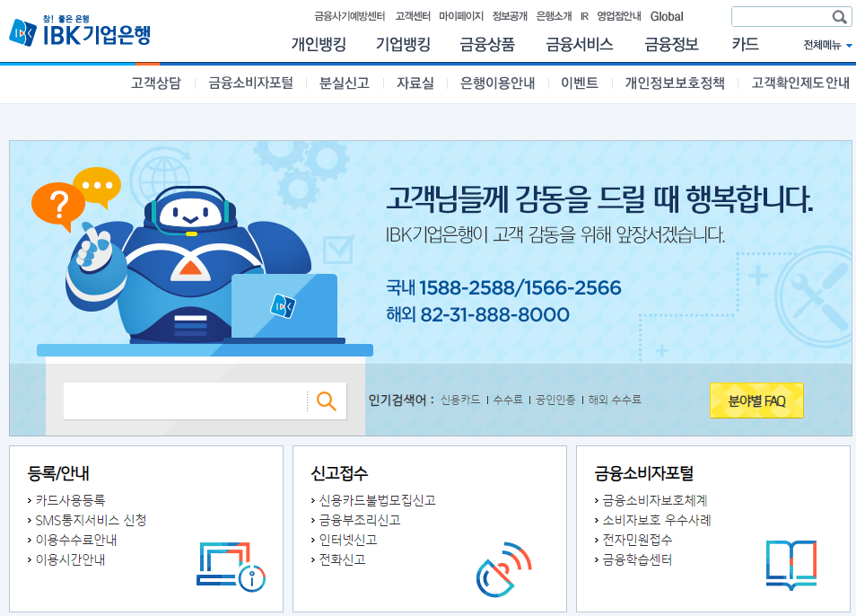 고객센터 페이지로 이동을 하고 나면 화면 중앙에 기업은행 고객센터 전화번호가 있는 것을 볼 수 있습니다.