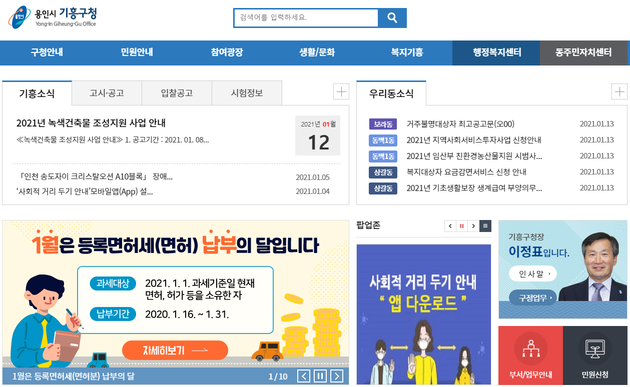 기흥구청을 자세히 살펴보기 위해서는 기흥구청 홈페이지로 접속하시는 것이 가장 빠른 방법입니다. 포털사이트에서 기흥구청을 검색하시면 간편하게 접속을 하실 수가 있습니다.