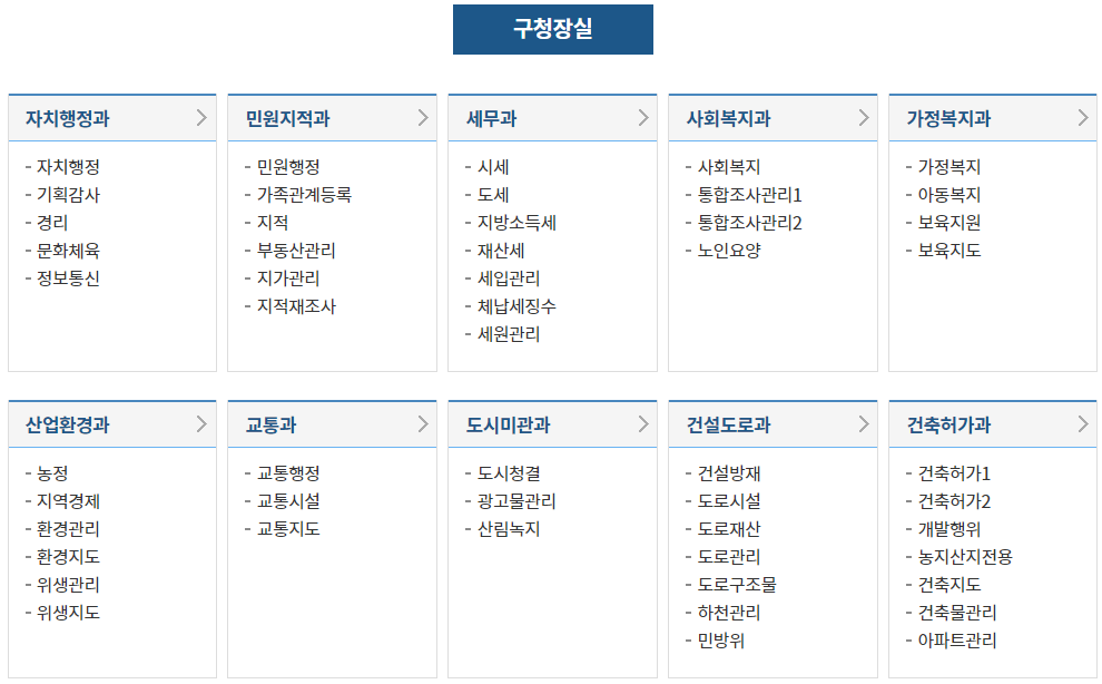 자치행정과 민원봉사과 세무과 사회복지과 가정복지과 산업환경과 교통과 도시미관과 건설도로과 건축허가과