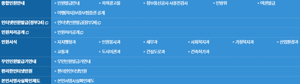 민원발급안내 옥외광고물 정보통신공사 사용전검사 민방위 여권발급 이행(하자)보증보험증권 공개