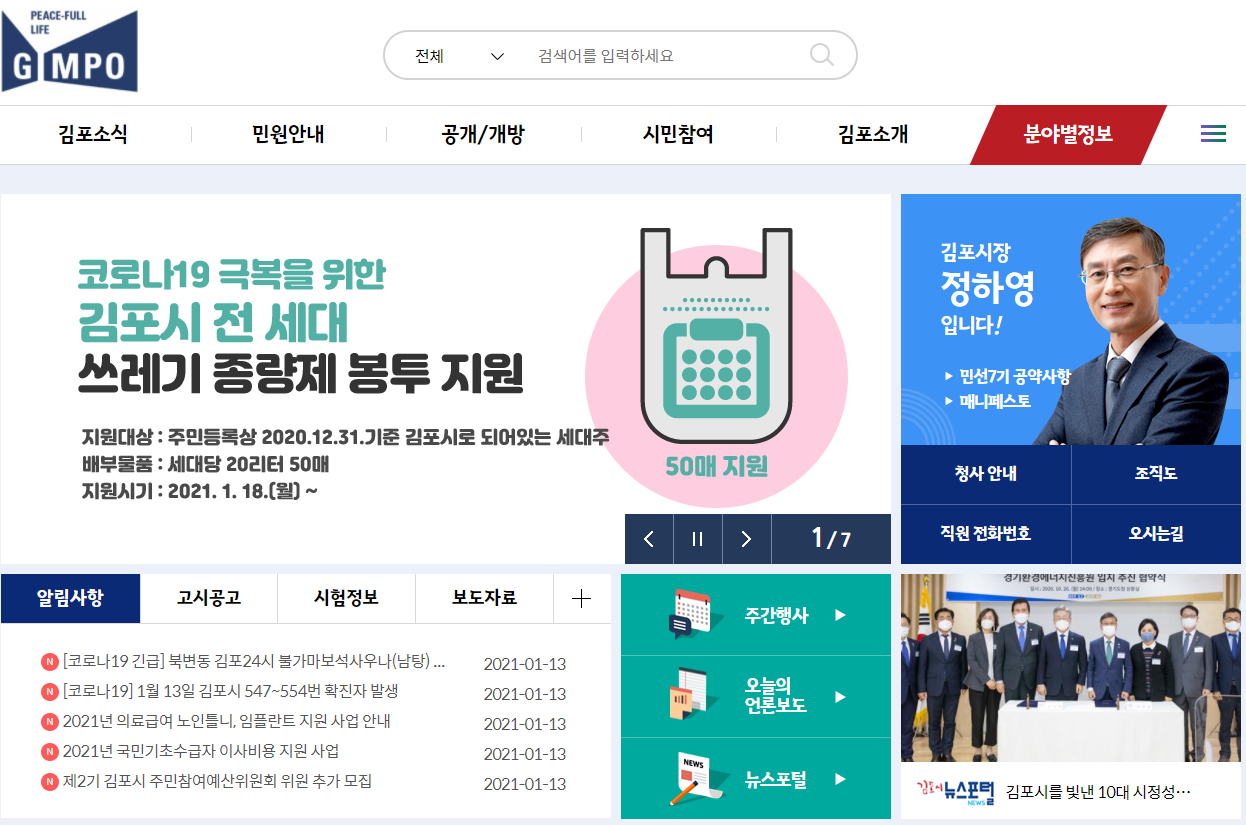 김포시청을 자세히 살펴보기 위해서는 김포시청 홈페이지로 접속하시는 것이 가장 빠른 방법입니다. 포털사이트에서 김포시청을 검색하시면 간편하게 접속을 하실 수가 있습니다.