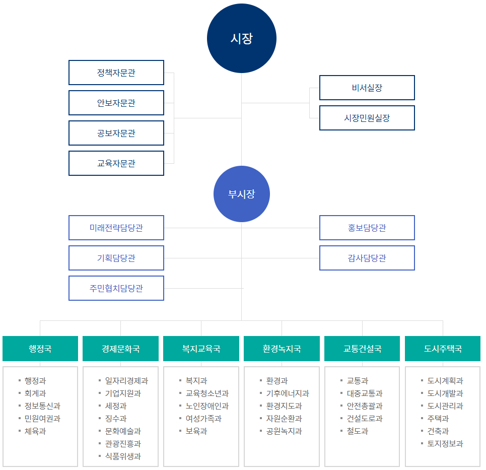 김포시청은 시장 아래에 부시장이 있으며 그 아래의 조직으로는 행정국, 경제문화국, 복지교육국, 환경녹지국, 교통건설국, 도시주택국 등의 부서가 있습니다.