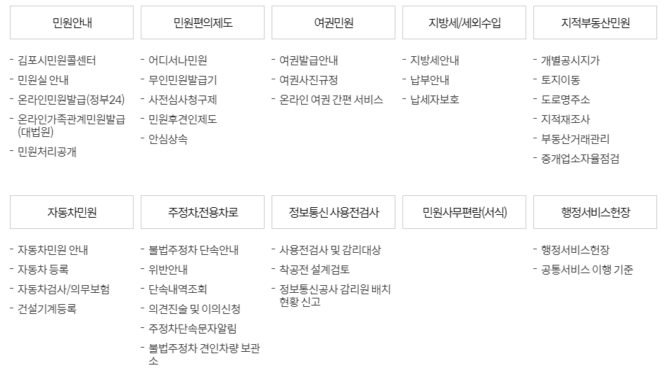민원 관련 세부 메뉴들을 살펴보면 다음과 같습니다. 또한 전화번호 안내, 업무 및 직원검색, 조직도, 청사안내 등의 바로가기 메뉴를 알아보겠습니다.