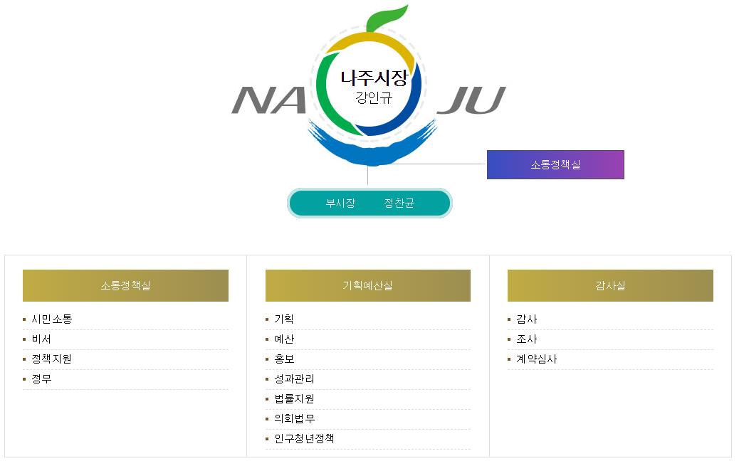 나주시청은 시장 아래에 부시장이 있으며 그 아래의 조직으로는 소통정책실, 기획예산실, 감사실, 총무국, 미래전략산업국, 안전도시건설국, 농업기술센터 등의 부서가 있습니다.