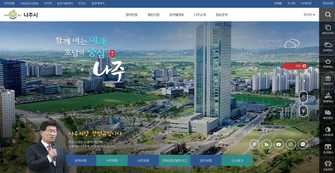 나주시청 홈페이지의 메인 화면입니다. 많은 업무를 수행하는 시청이기 때문에 아주 다양한 메뉴들을 확인하실 수 있습니다. 주요 메뉴로는 참여민원, 열린시정, 분야별정보, 나주소개, 정보공개의 메뉴가 있습니다.
