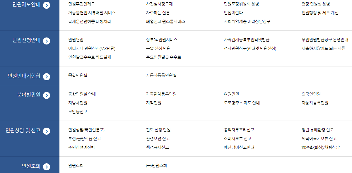 민원제도안내민원후견인제도사전심사청구제민원조정위원회 운영연장 민원실 운영거동불편인 서류배달 서비스자주하는 질문민원미란다민원행정 및 제도 개선국제운전면허증 대행처리폐업신고 원스톱서비스사회취약계층 배려상담창구