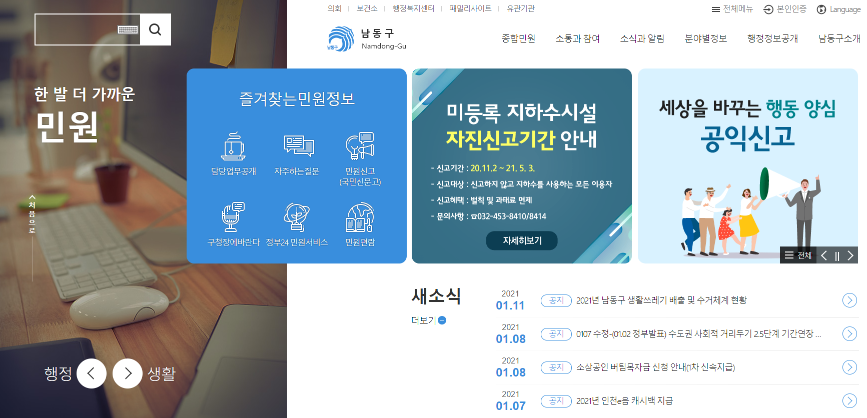 남동구청 홈페이지의 메인 화면입니다. 많은 업무를 수행하는 구청이기 때문에 아주 다양한 메뉴들을 확인하실 수 있습니다. 주요 메뉴로는 종합민원, 소통과참여, 소식과알림, 분야별정보, 행정정보공개, 남동구소개의 메뉴가 있습니다.