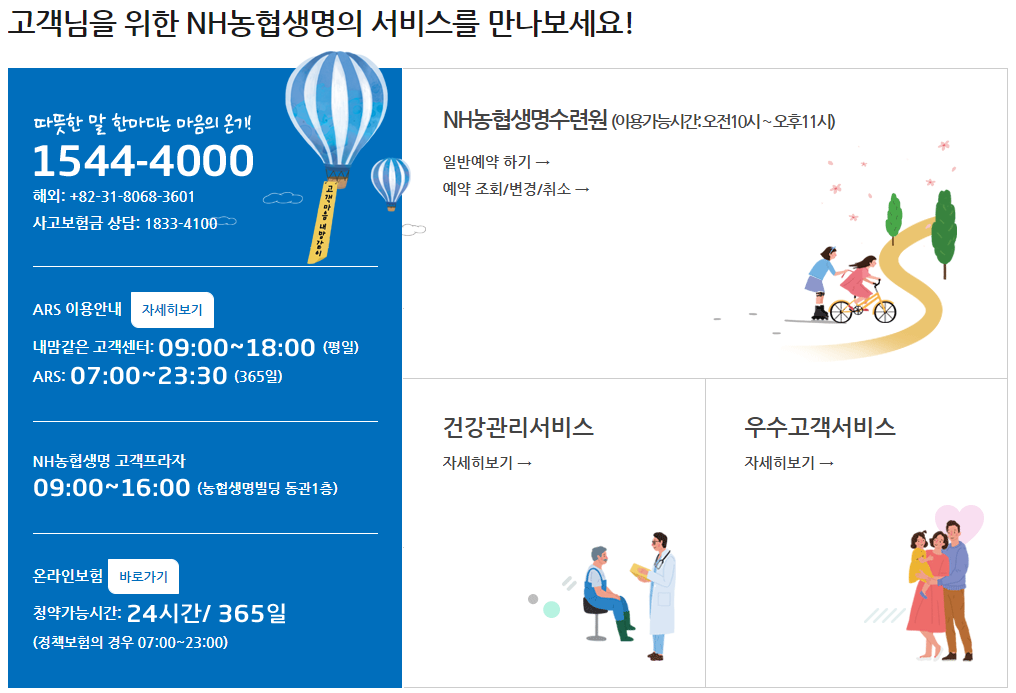 농협생명 고객센터 전화번호는 1544-4000입니다. 해외에서 거실 때에는 82-31-8068-3601입니다. 사고보험금 상담은 1833-4100입니다.