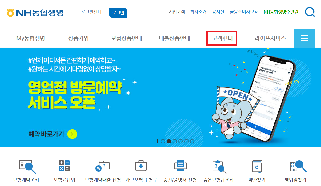 농협생명 홈페이지로 접속을 하면 아래와 같은 메인화면이 나옵니다. 상단에는 MY농협생명, 상품가입, 보험상품안내, 대출상품안내, 그리고 고객센터가 있습니다.