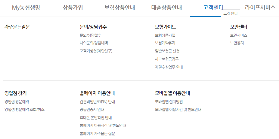 고객센터의 메뉴를 보면 다음과 같습니다.