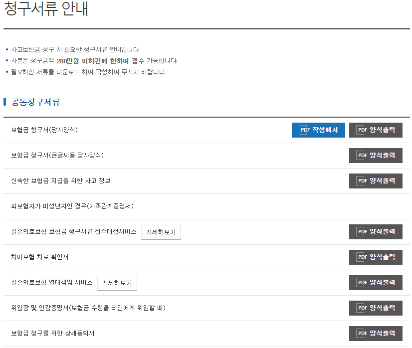 보험금을 청구하는 경우 가입한 내용에 따라 청구서류가 다르기 때문에 홈페이지에서 미리 확인을 하시거나 상담원에게 확인을 받고 서류를 발급받는 것이 좋습니다.