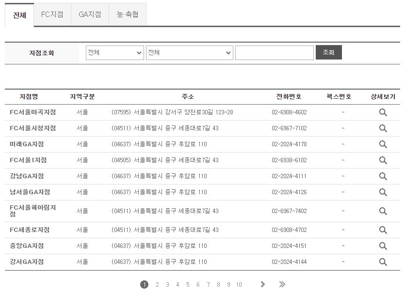 FC지점, GA지점, 가까운 농축혐 모두 검색이 가능합니다.