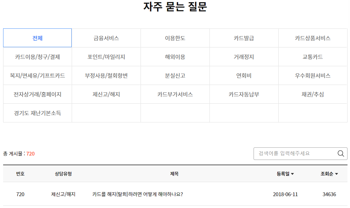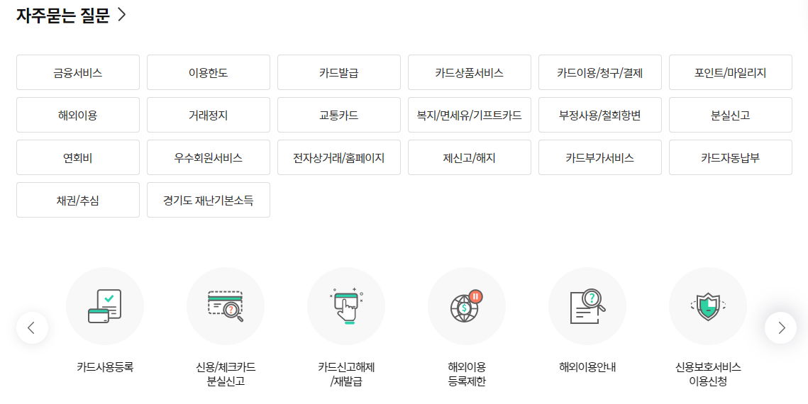 자주 묻는 질문은 금융서비스, 이용한도, 카드발급, 카드상품서비스, 카드이용/청구/결제, 포인트/마일리지, 해외이용, 거래정지, 교통카드, 복지/면세유/기프트카드, 부정사용/철회항변, 분실신고, 연회비, 우수회원서비스, 카드부가서비스 등의 항목으로 분류가 되어 있습니다.