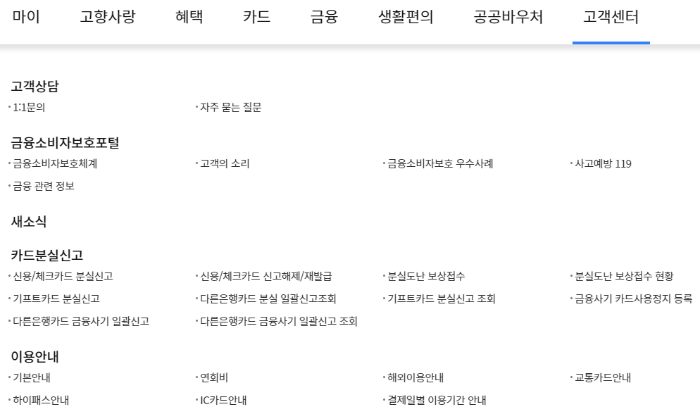 - 이용안내 : 기본안내, 연회비, 해외이용안내, 교통카드안내, 하이패스안내, IC카드안내, 결제일별 이용기간 안내