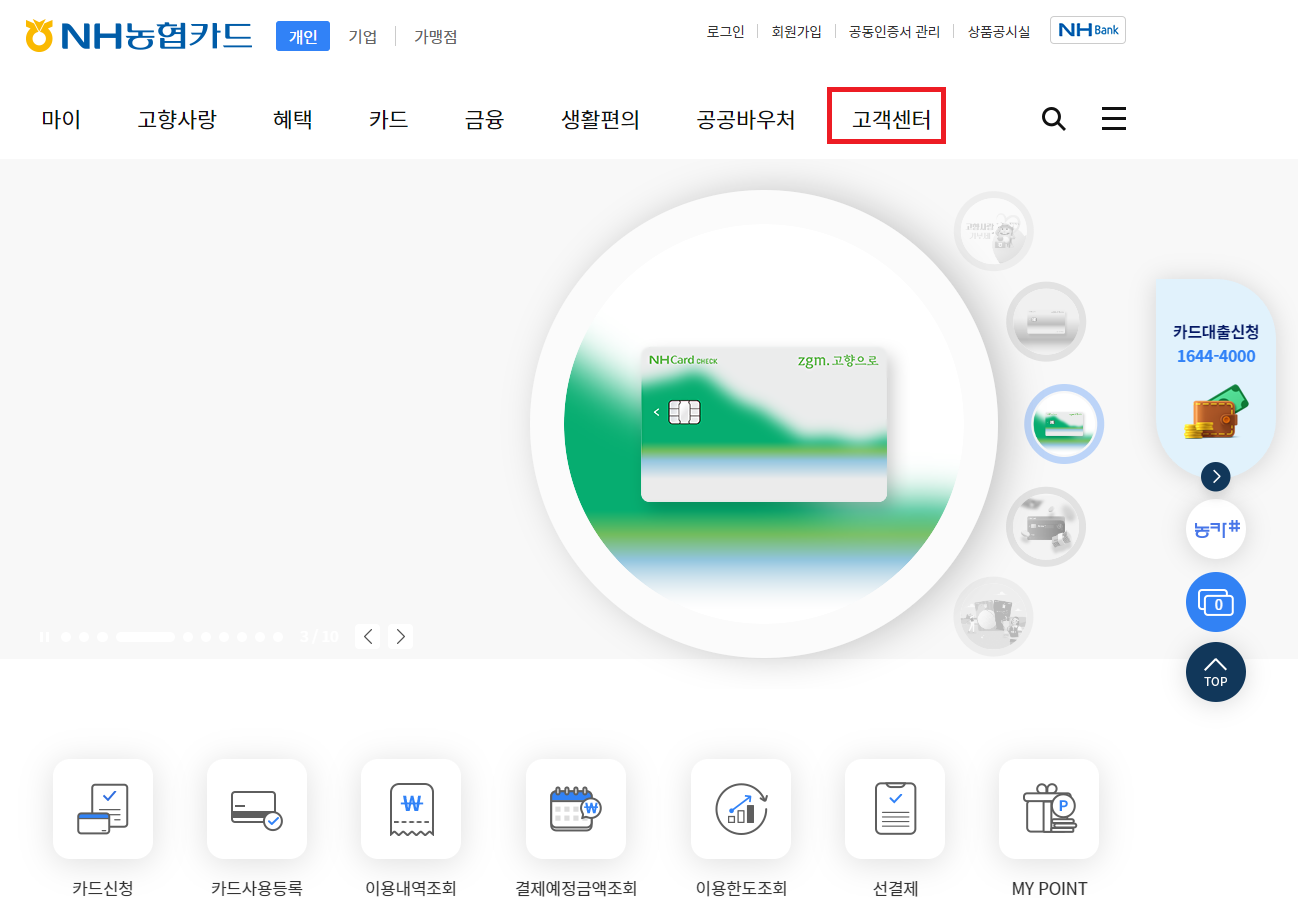 농협카드 홈페이지로 접속을 하게 되면 상단에 주요 메뉴가 위치해 있습니다. 마이, 고향사랑, 혜택, 카드, 금융, 생활편의 공공바우처, 그리고 고객센터가 위치해 있습니다.